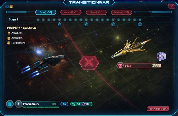 Each difficulty level has 20 stages. Players must pass all stages to unlock the next difficulty level. HP lost in battle cannot be restored. But players can buy "Revive Chances" to restore HP for their fleet. Only one revive chance can be purchased in each difficulty level. Each time you unlock a new difficulty level, all your fleets' HP will restore automatically.